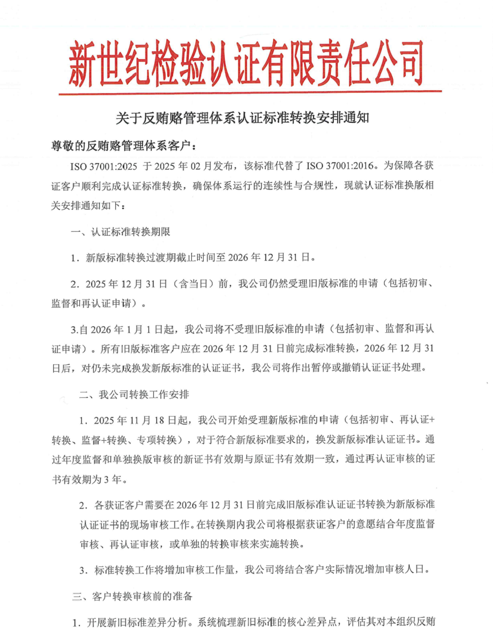 3.自2026年1月1日起,我公司將不受理舊版標(biāo)準(zhǔn)的申請(包括初審、監(jiān)督和再認(rèn)證申請)。所有舊版標(biāo)準(zhǔn)客戶應(yīng)在2026年12月31日前完成標(biāo)準(zhǔn)轉(zhuǎn)換,2026年12月31日后,對仍未完成換發(fā)新版標(biāo)準(zhǔn)的認(rèn)證證書,我公司將作出暫停或撤銷認(rèn)證證書處理。